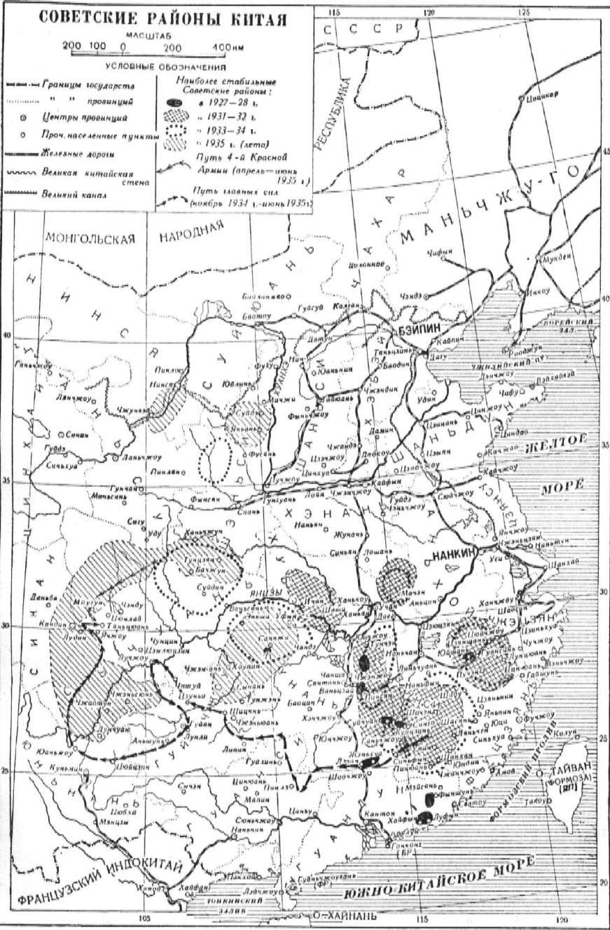 В 1931 — 1934 гг. в состоянии беспрерывной жестокой войны с силами гоминьдановской реакции существовали шесть более или менее устойчивых советских районов. Из них четыре находились в Юго-Восточном Китае, один в. Центральном Китае (на границе провинций Хубэй — Хэналь — Аньхой) и один в Западном Китае (в провинции Сычуань). Главным из них был Центральный советский район на юго-востоке провинции Цзянси.