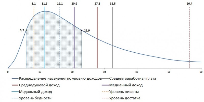 Заштрихованная область, которая соостветствует уровню доходов 50% населения с наибольшей плотностью распределения. Таким образом, уровень доходов типичного жителя России находится в пределах от 5,7 тыс. руб. до 22,9 тыс. руб. По данным 2014 года (см.).