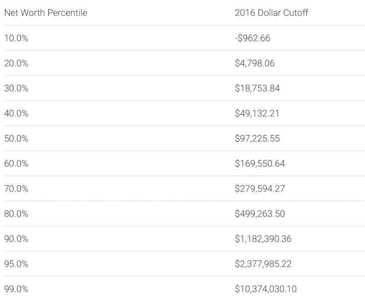 Таким образом, 10% самых бедных должны $962 (то есть их долги больше стоимости их активов на $962). Вторые по бедности 10% (вторая дециль) имеют грубо $4,8 тыс. (то есть всё их состояние в среднем равняется $4800). Третья дециль имеет в среднем состояние $18,7 тыс. и так далее.