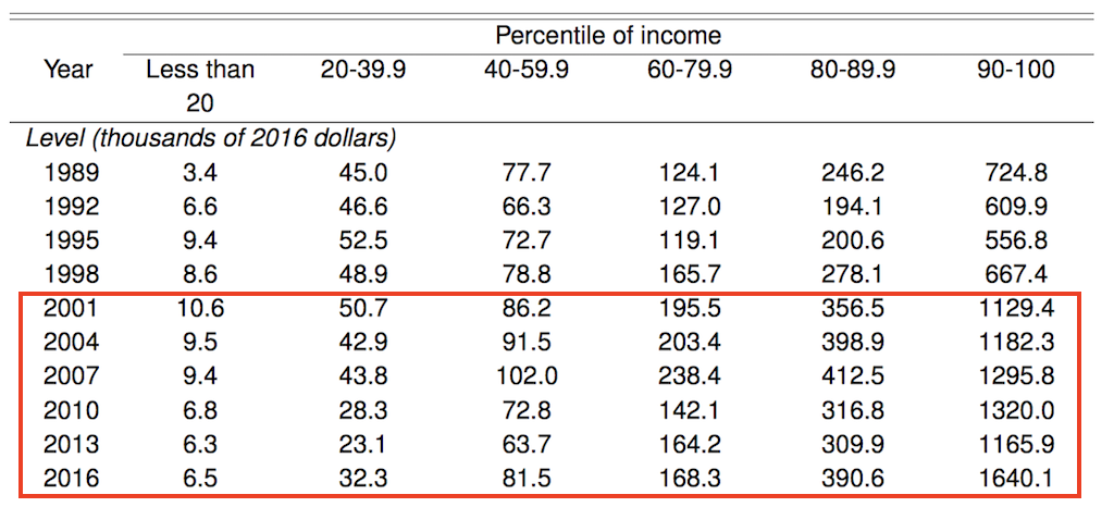 Однако, как это обычно бывает в статистике буржуазной власти, проблема в том, что до сих пор никто не делал разбивки по группам населения. Президенты Буш и Обама отчитывались о росте благосостояния населения, но никто не знал какие группы населения собственно богатеют и как оказалось беднеют. И вот ФРС наконец сделал такой анализ и опубликовал его.